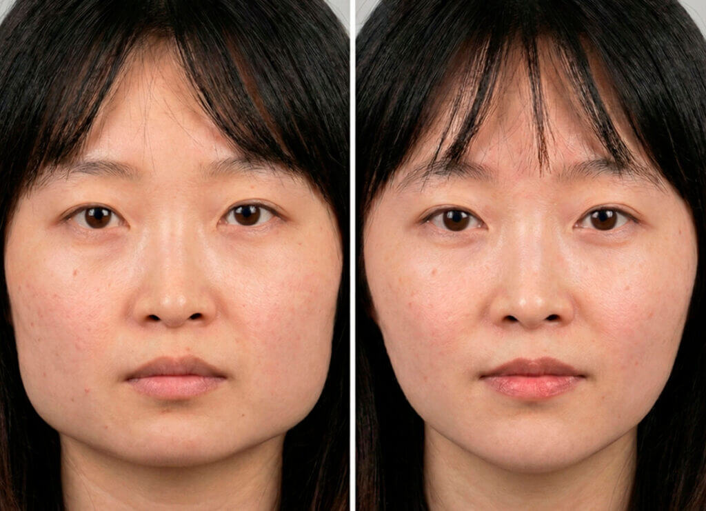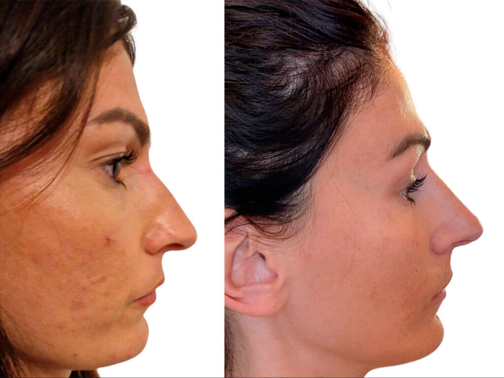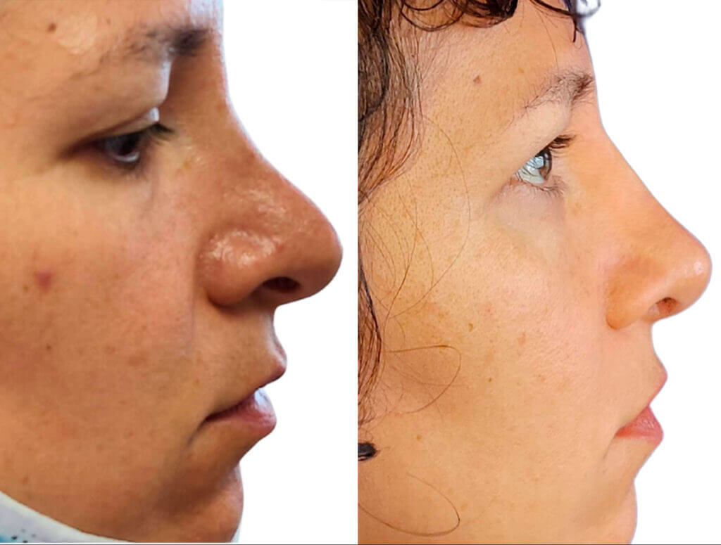 • Nasal details without surgery: small hump, saddle/flat bridge, tip drop in profile
